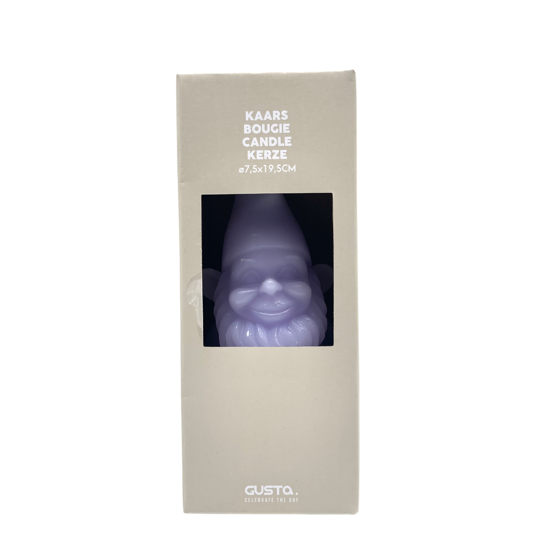 Grappige tuinkabouter van Gusta, maar dan als kaars in huis. Klein maar wel 16 branduren. Leverbaar in groen en lila.